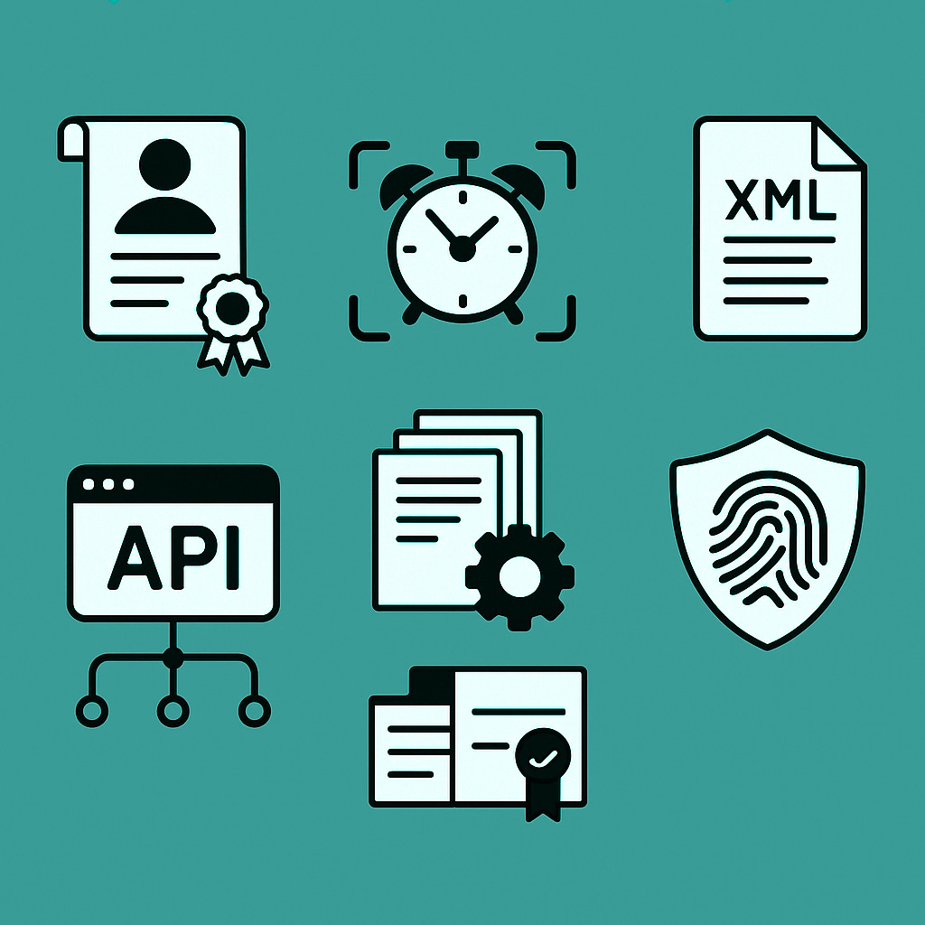 Geração automática de XMLs, assinatura eletrônica ICP-Brasil, carimbo do tempo, RVDD e validação com consulta pública.